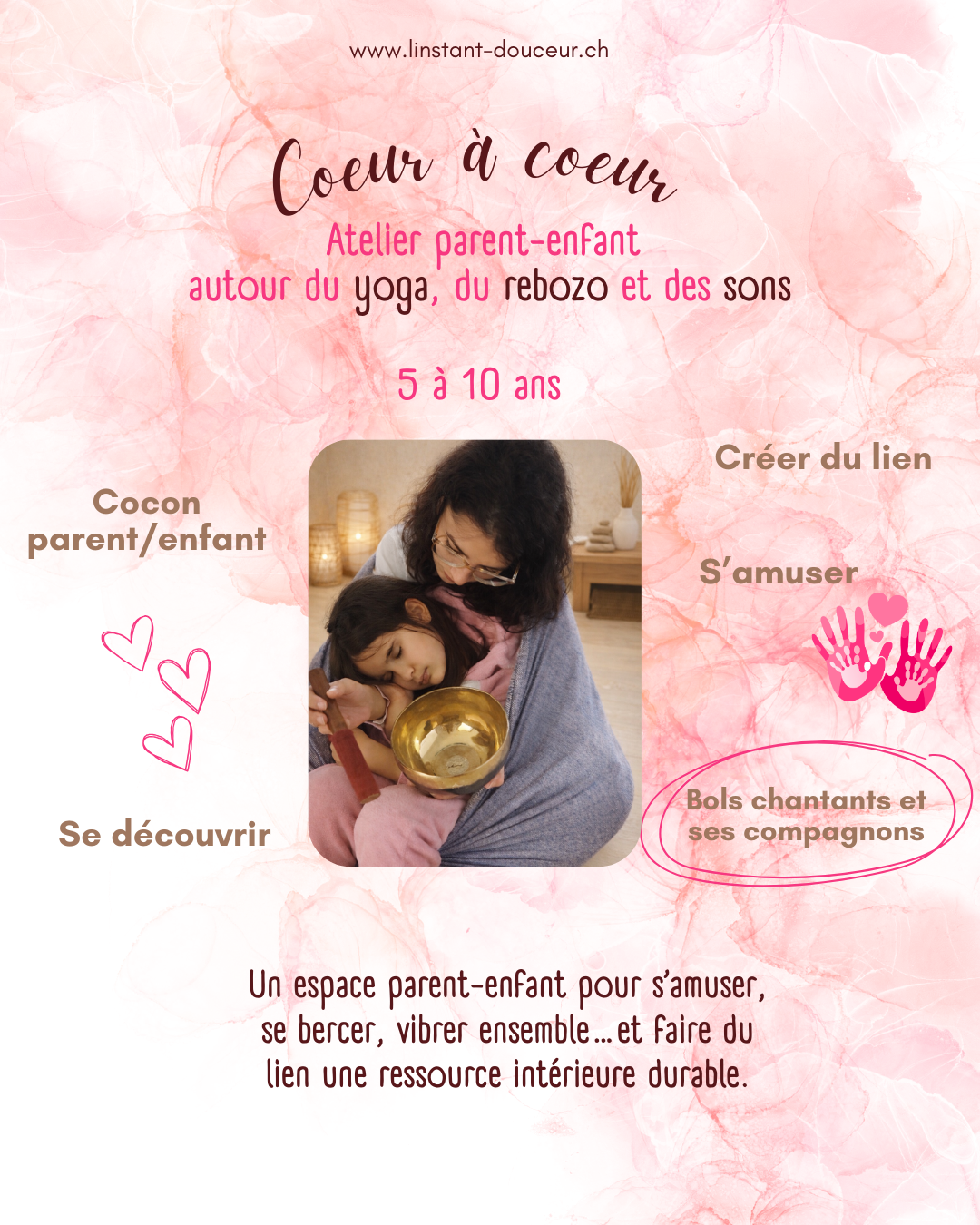 Cœur à Cœur est une bulle hors du temps pensée pour renforcer le lien d’attachement, s’amuser ensemble et découvrir le yoga, le Rebozo et la magie des bols chantants.
